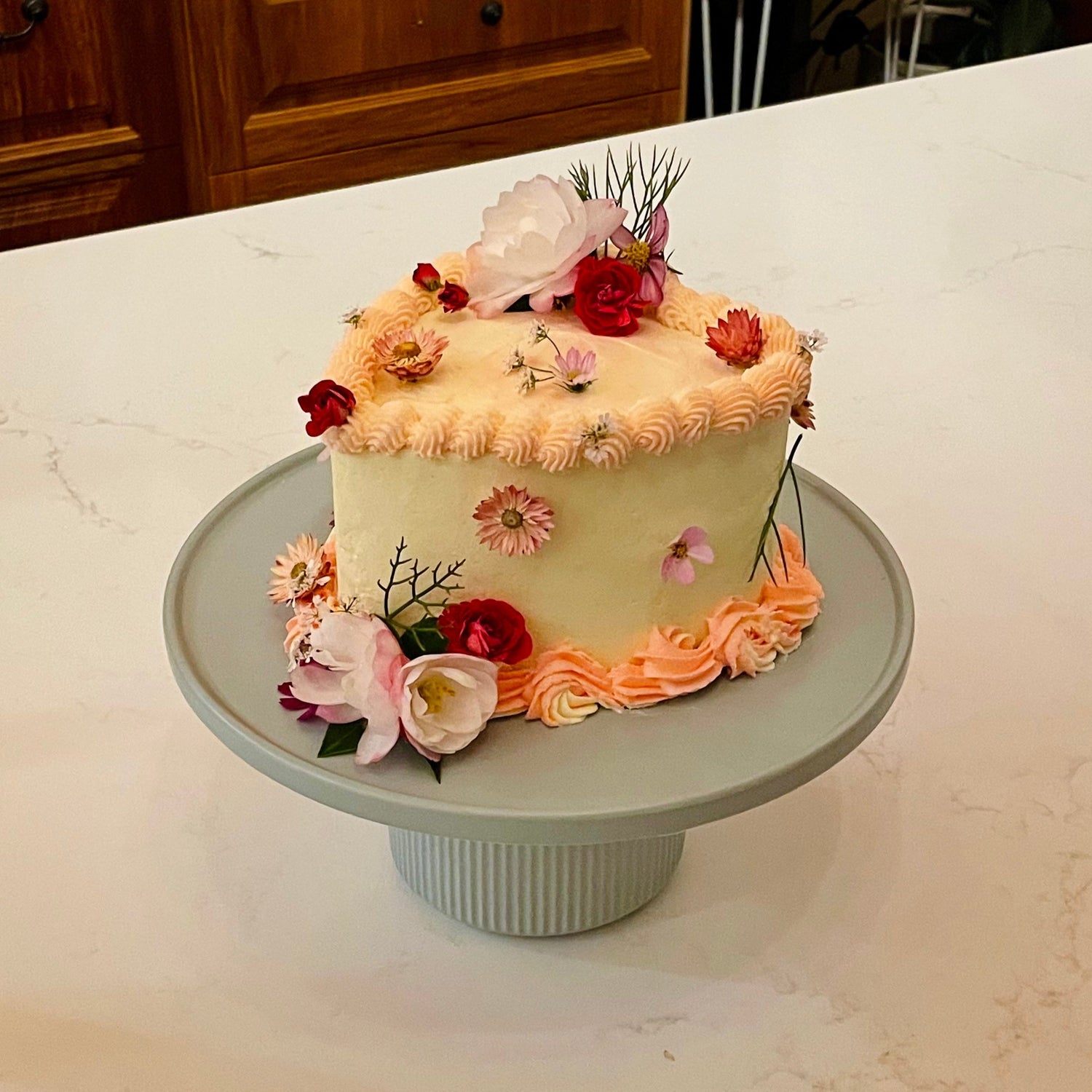 Modern heart-shaped cake in shades of soft pinks and white. Decorated with fresh flowers and botanicals.