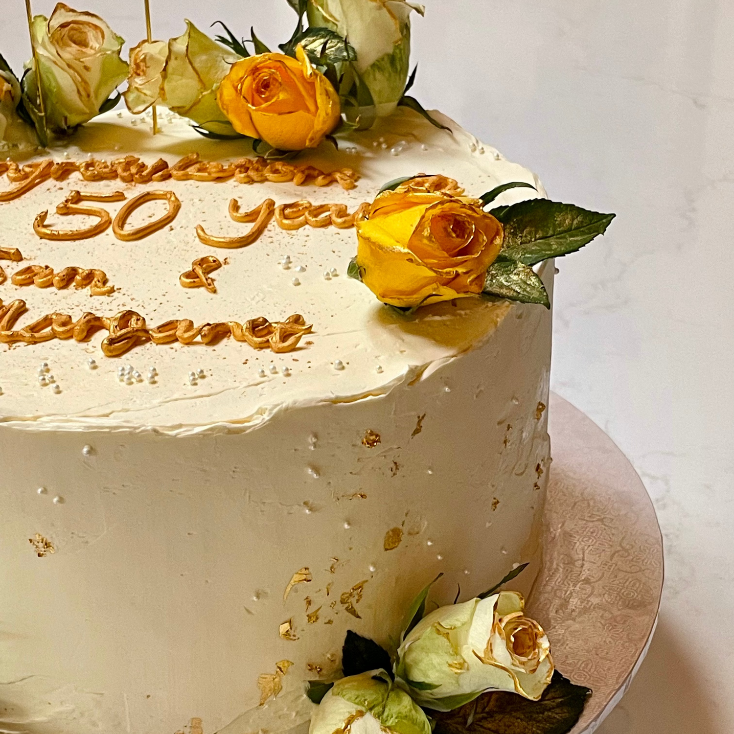 Golden Anniversary cake with textured icing, gold leaf, and mini pearls. Decorated with gold writing and fresh roses brushed gold.