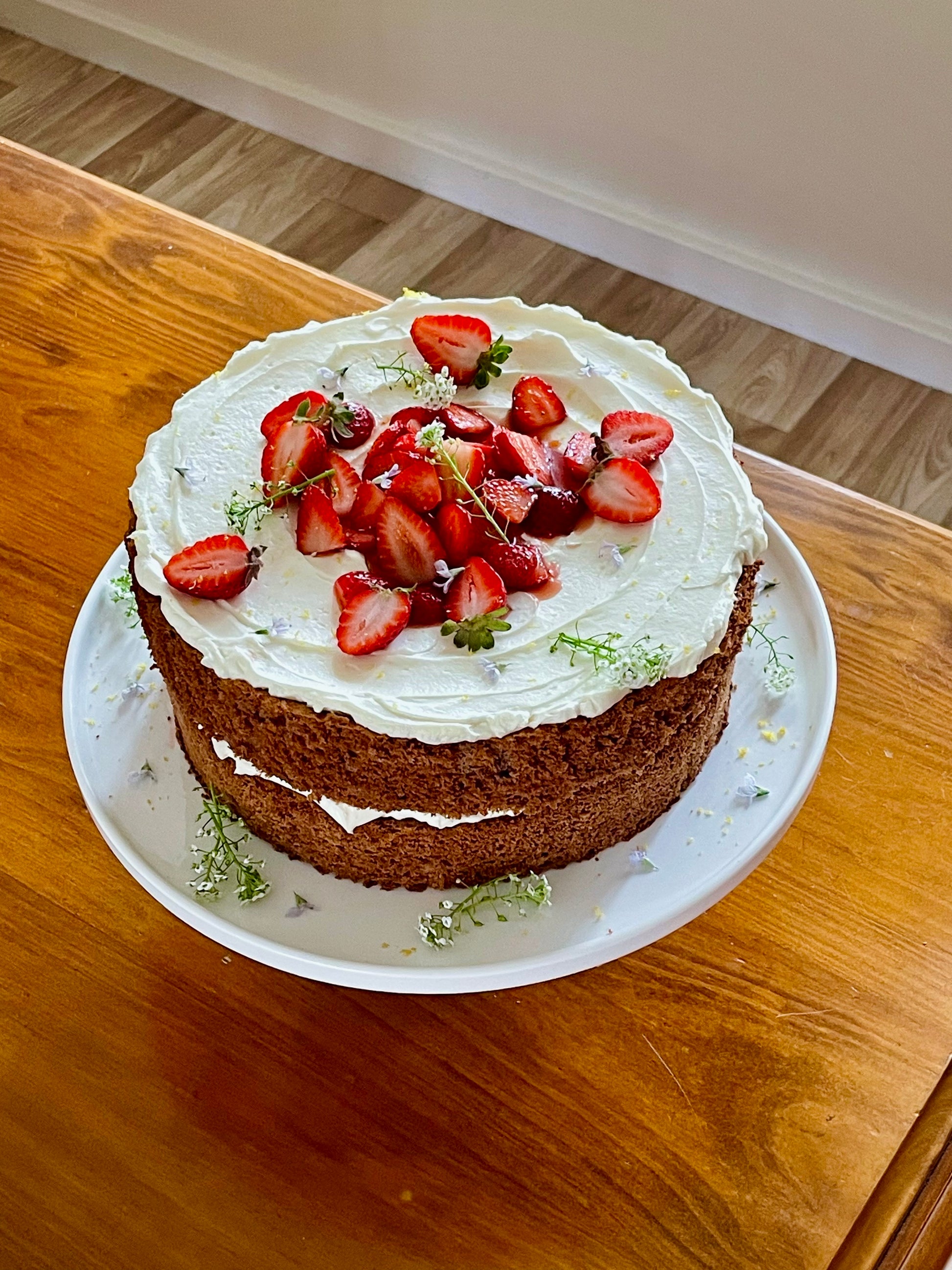 A deliciously light sponge cake elevated by warm spices like ginger and cinnamon. Paired with a whipped lemon mascarpone cream and balsamic strawberries.
